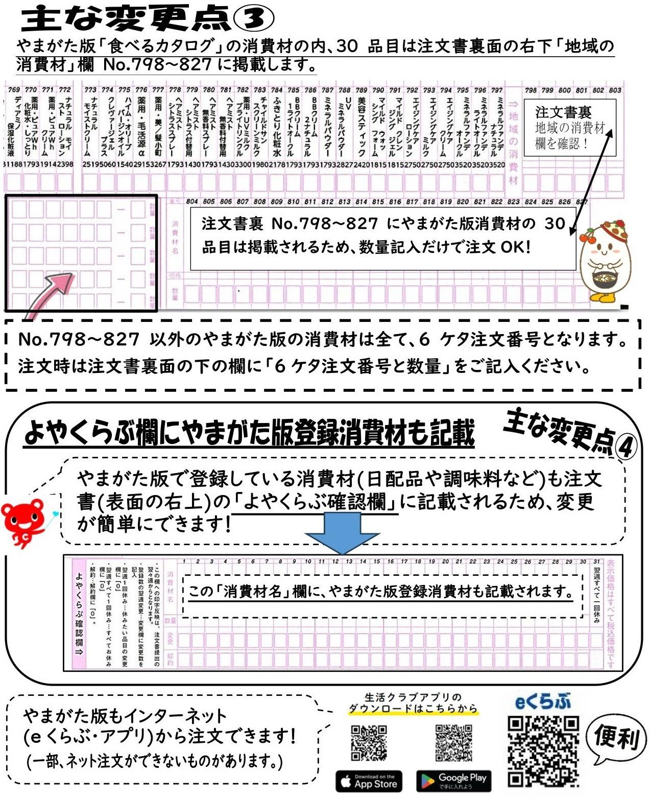 やまがた版の消費材の3桁番号は注文用紙の裏面右下に掲載され、6桁番号の消費材は裏面下部の欄で注文します。
